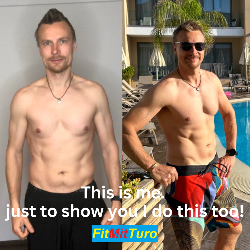 With Turo´s help I also understood that scale is not the best way to measure my progress and I was surprised to see the difference in my pictures. I couldn’t believe my eyes when I saw what had happened within the last month. (Pictures below are only one month difference) Now I literally don’t care what scale is saying when I know what difference I see in the mirrow.